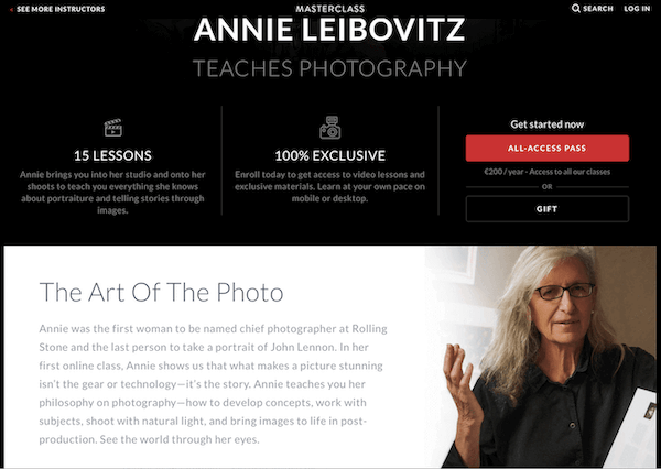 - MasterClasshas incredible course - 15 video lessons with famous photographer Annie Leibovitz and access to all masterclass classes costs just €200/per year.
