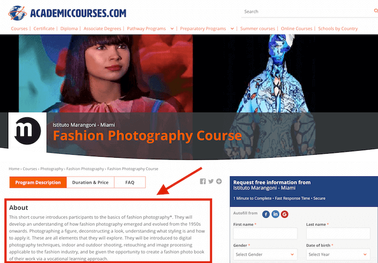 - In Academic Courses we found 8 great fashion photography courses organized in different countries (USA, Italy, United Kingdom, Spain), e.g. one in Miami: duration 3 weeks, price - $5,000. As well you can check this course directly on the Istituto Marangoni website.