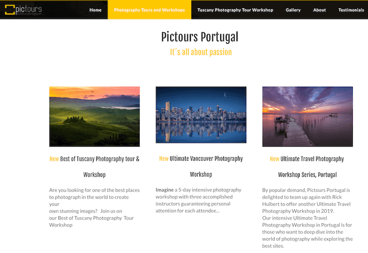 - Pictours offers to join workshops in Portugal with photographers Rick Hulbert, Fernando Piçarra and Marion McCristall. You can choose: one day tours (in Lisbon, Sintra and Cabo da Roca, Monserrate Palace and Seascapes, etc.), private photography tours or scheduled tours (e.g. “Best of Tuscany“ 8-days workshop, price - €3745).
